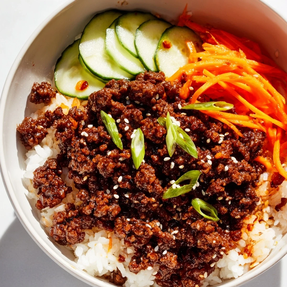 - Divide the steamed rice among four bowls. Top each bowl with the saucy beef, then arrange the julienned carrots, sliced cucumber, scallions, and toasted sesame seeds on top. Add kimchi or fresh cilantro if you want to.