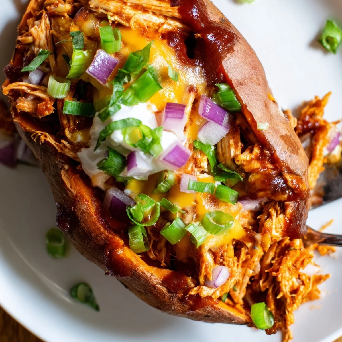 Roasted sweet potatoes serve as the perfect vessel for tender, saucy BBQ chicken in this hearty main dish. The natural sweetness of the potatoes balances beautifully with smoky barbecue flavors, while melted cheddar ties everything together. Fresh green onions and herbs add brightness and crunch to complete the dish.