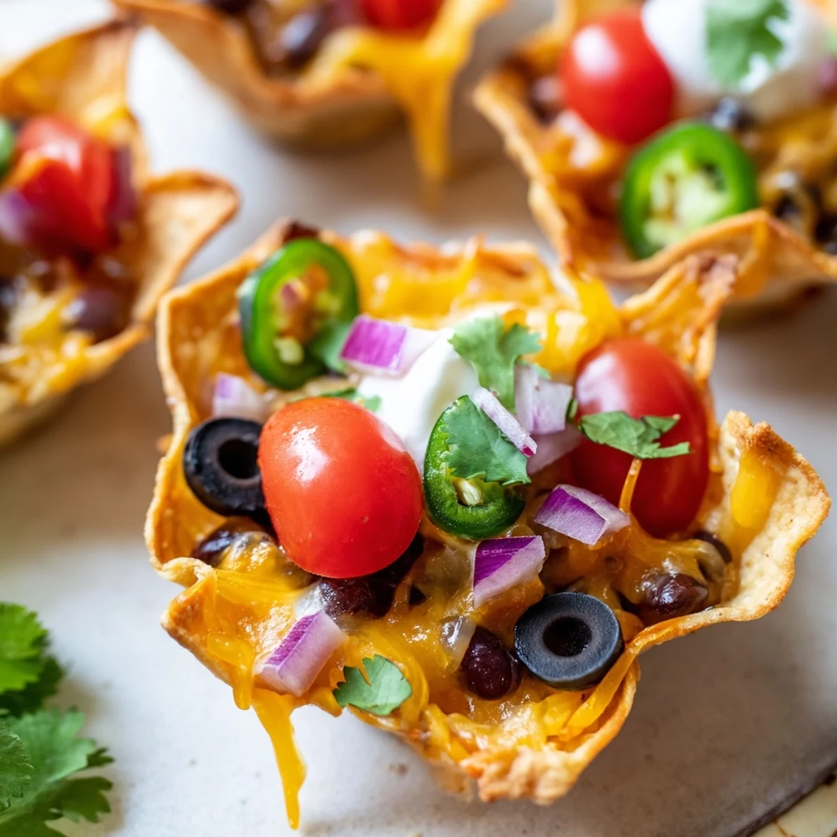 Transform ordinary tortilla chips into irresistible handheld vessels of cheesy goodness. These crispy cups feature a blend of cheddar and Monterey Jack, topped with black beans, diced tomatoes, black olives, and just the right kick of jalapeño. Everything bakes together in under 10 minutes until the cheese becomes perfectly melted and bubbly.