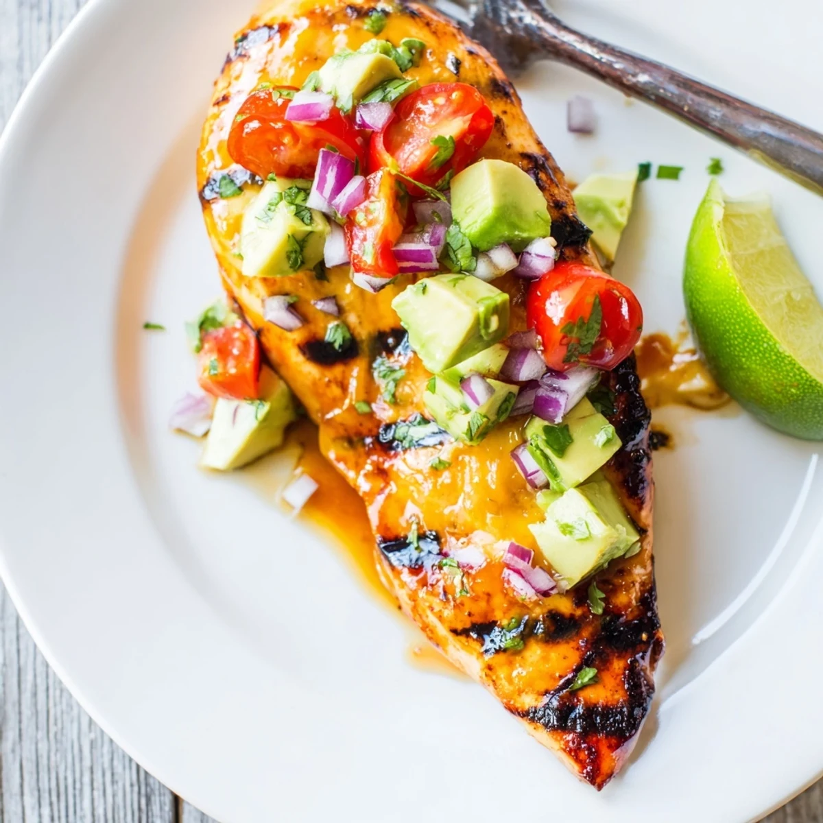 Marinate boneless chicken breasts in lime juice, olive oil, garlic, honey and Tex-Mex spices for 15 to 120 minutes, then grill 6 to 8 minutes per side until 165°F. Top with a salsa of diced avocado, cherry tomatoes, red onion and cilantro; optionally melt Monterey Jack during the last minutes. Serve with lime wedges, tortillas or rice for a bright, summery main. Add jalapeño for heat or omit cheese for dairy-free.