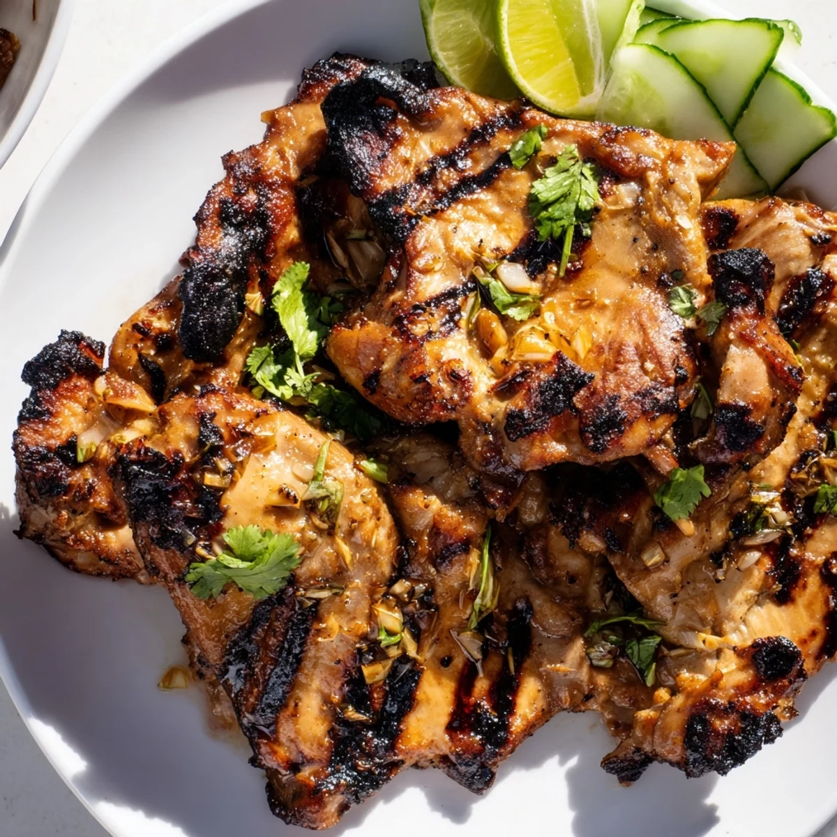 This Vietnamese-style grilled chicken features tender thighs marinated in a fragrant blend of lemongrass, garlic, shallots, and fish sauce. The marinade infuses the meat with authentic Southeast Asian flavors, while grilling creates beautiful char marks and enhances the natural sweetness. Perfect for a weeknight dinner or weekend gathering, this dish pairs beautifully with steamed jasmine rice or vermicelli noodles. The preparation is straightforward—simply combine the marinade ingredients, let the chicken soak up the flavors for at least an hour, then grill until cooked through and slightly charred. Garnish with fresh cilantro, lime wedges, and cucumber for a complete, vibrant meal.
