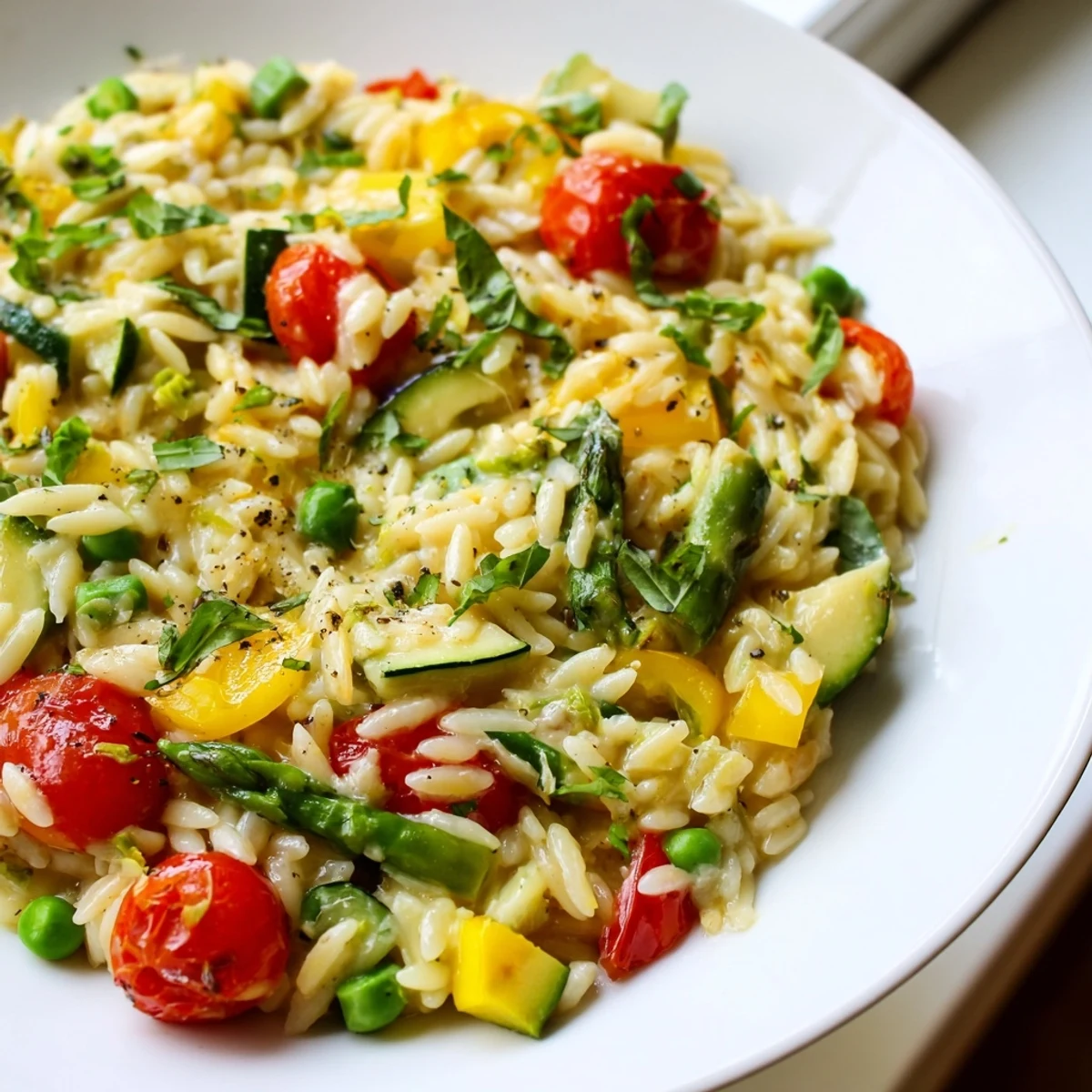 This vibrant Italian-inspired dish combines tender orzo pasta with a colorful medley of spring vegetables including zucchini, cherry tomatoes, bell pepper, asparagus, and sweet peas. The vegetables are lightly sautéed with garlic until crisp-tender, then tossed with al dente orzo in a bright lemon-Parmesan sauce. Fresh basil and parsley add aromatic depth, while reserved pasta water creates a silky coating that clings to every bite. Perfect for weeknight dinners or light spring entertaining.