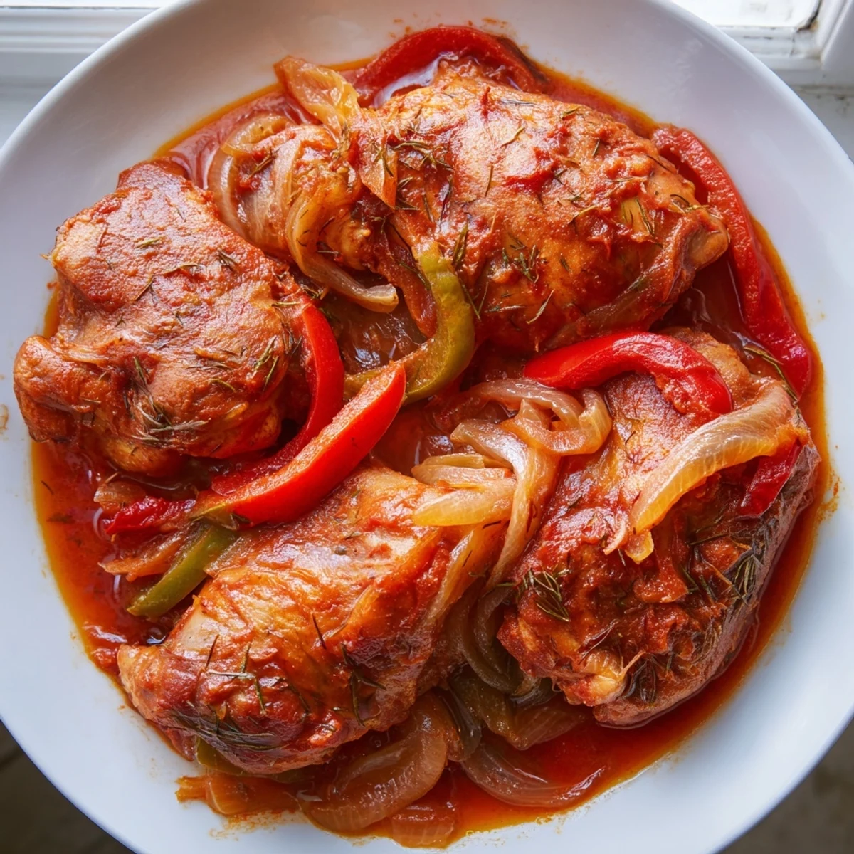 This vibrant West African dish features tender chicken thighs marinated in lemon, garlic, and ginger, then simmered slowly in a rich tomato-based sauce. The aromatic blend of onions, bell peppers, thyme, and paprika creates layers of flavor that develop beautifully during cooking. A whole Scotch bonnet pepper adds subtle warmth without overwhelming heat, while the sauce thickens naturally into something perfect for spooning over fluffy rice or couscous.