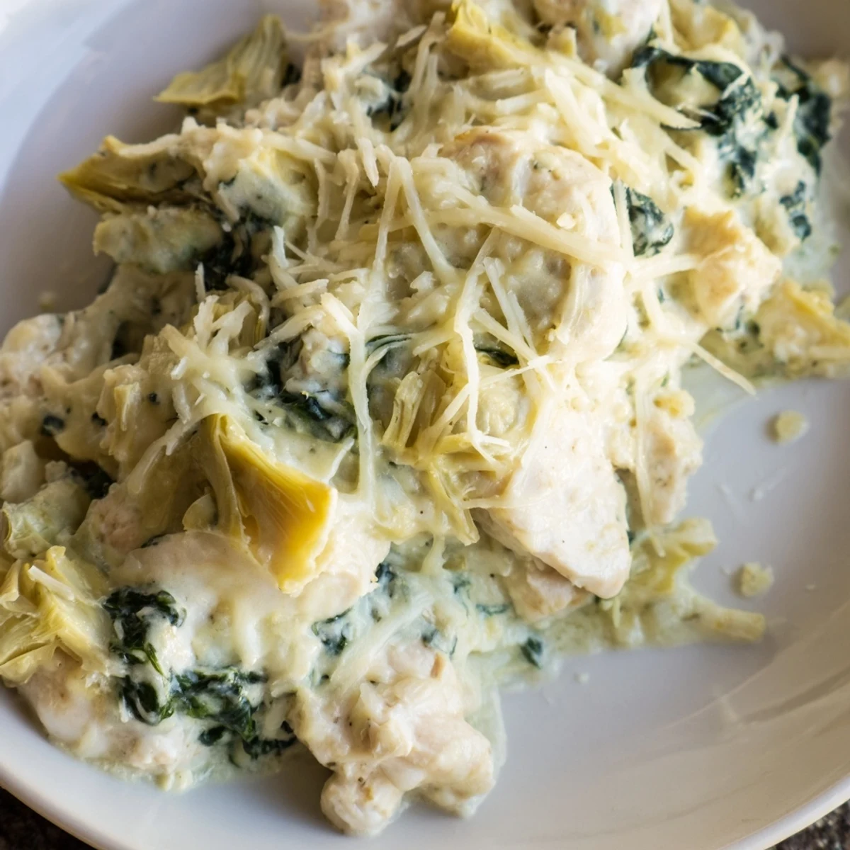 This comforting chicken bake transforms the classic spinach and artichoke dip into a hearty main dish. Boneless chicken breasts are topped with a rich, creamy blend of spinach, artichoke hearts, cream cheese, sour cream, and melted mozzarella. The result is a golden, bubbly casserole that's both indulgent and satisfying.