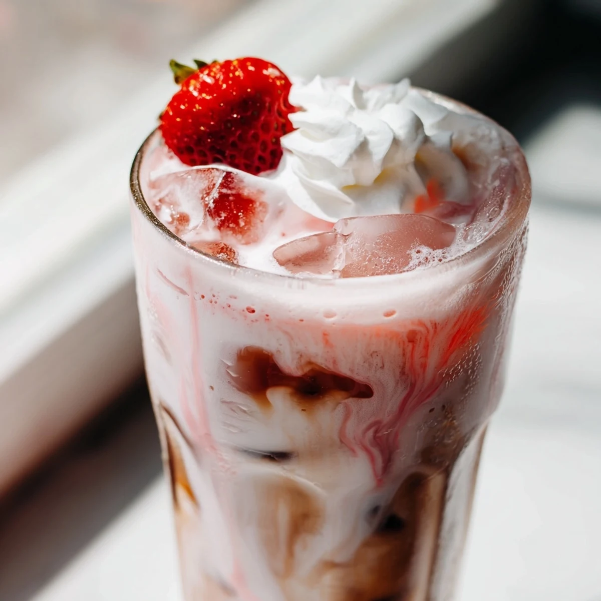 Beat the summer heat with this indulgent strawberry cream cold latte. Fresh strawberries are gently heated with sugar until soft and juicy, then blended into a smooth puree that forms the vibrant base. The sweet strawberry mixture combines with cold whole milk and rich heavy cream, creating a luscious foundation. Cold brewed espresso pours slowly over the top, creating a beautiful marbled effect that looks stunning in tall glasses. Ready in just 10 minutes with no cooking required, this chilled beverage delivers the perfect balance of fruity sweetness and robust coffee flavor.